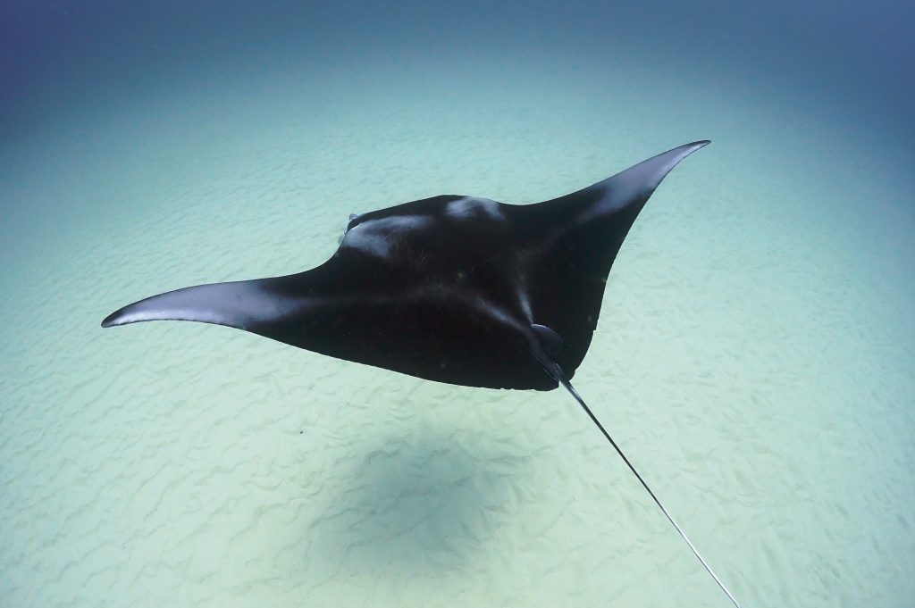砂地に真っ黒の背中!この組み合わせが見れるのも砂地ならではですね。形もかっこいいマンタさん!