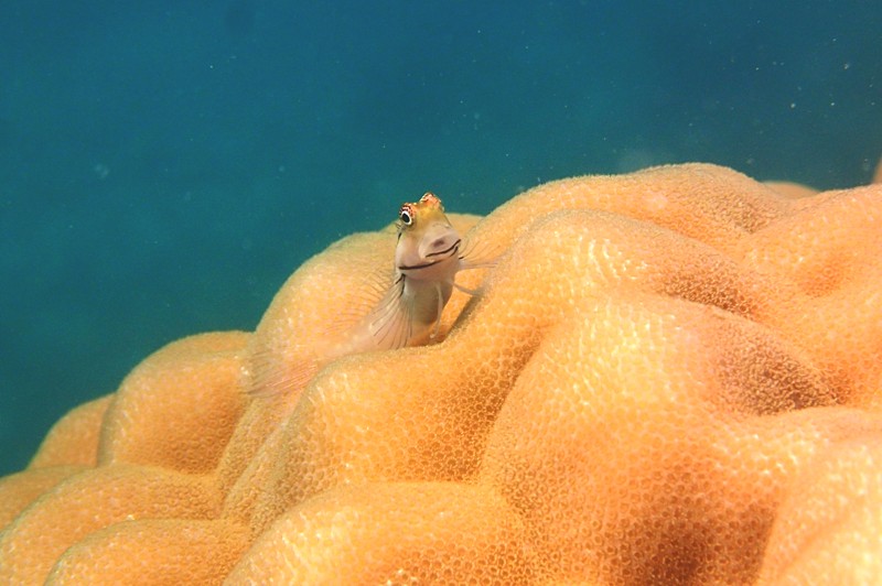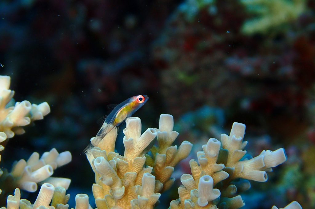 サンゴの上には、目がピンク色。体は綺麗な透明のアカメハゼも多く見られました!