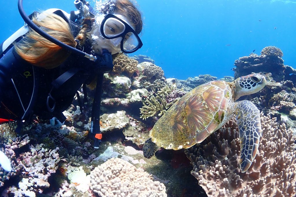 初めてのダイビングにチャレンジ~!2ダイブ目はすっかり水中にも慣れて、いつもここでお休み中のカメ吉にも会いに行ってきました!