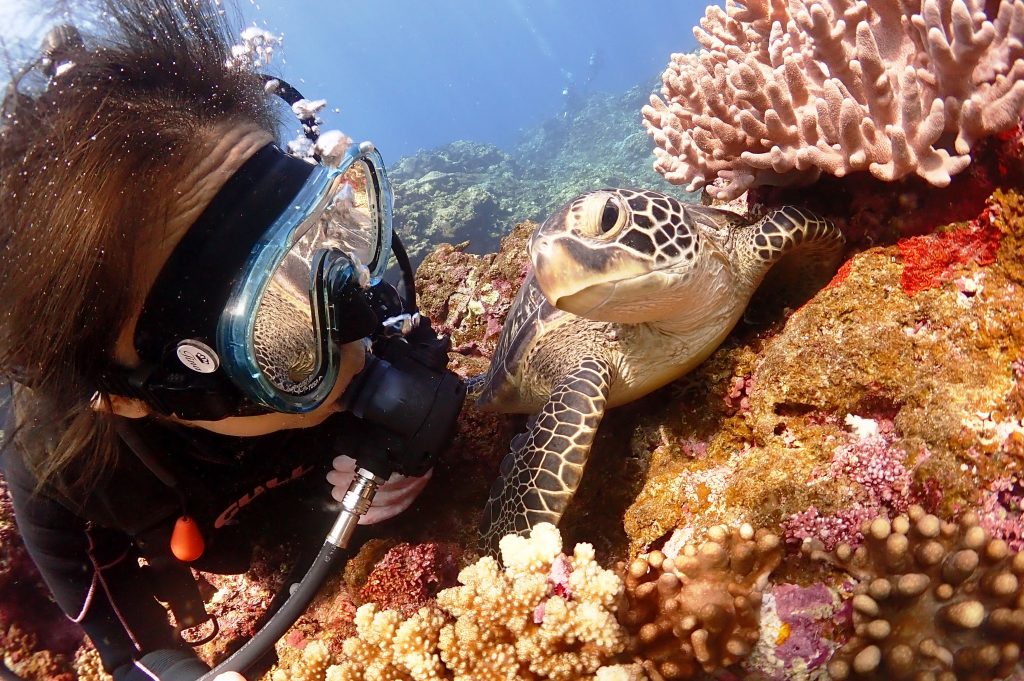 カメ吉と遊んだ地元ダイバーのIピー!カメ吉もにらっめこ~。
