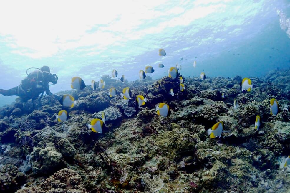 時折、群れで集まってくるところを撮影タイム~。形の色合いも綺麗なチョウチョウウオ。