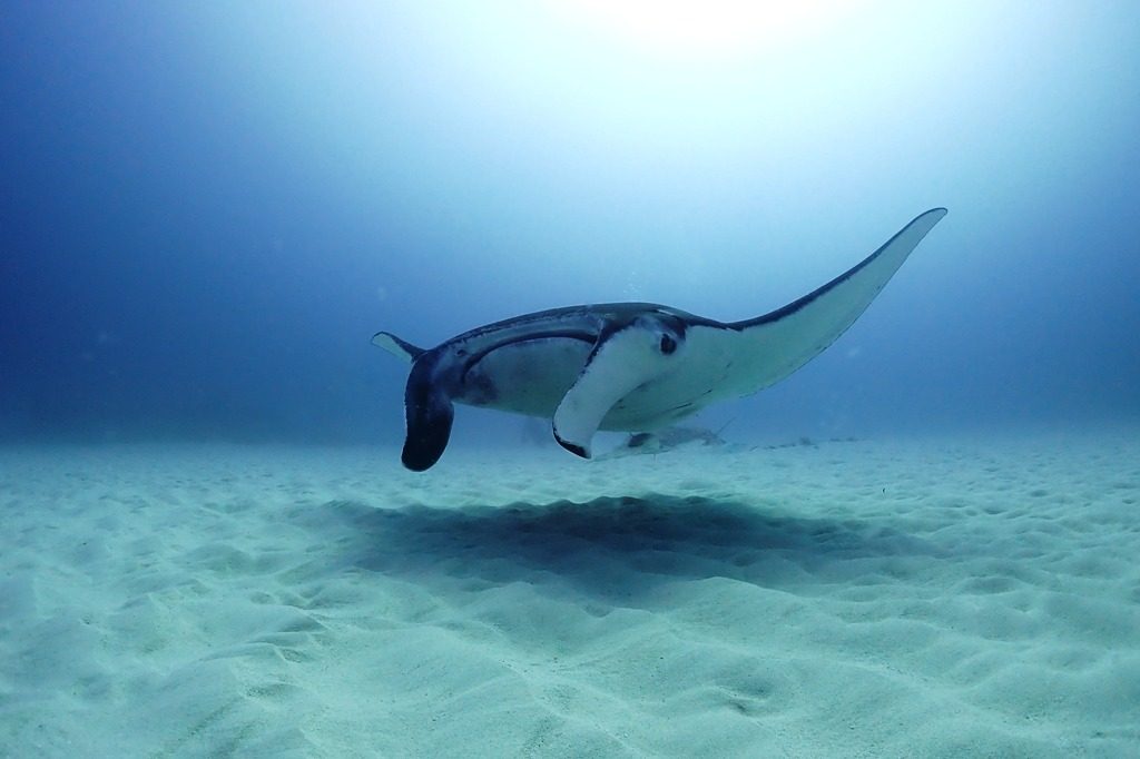 白い砂地にマンタさん!こうやって背中の部分を見ると大きいですね~!黒い背中に白い砂地がさらに映えますね!