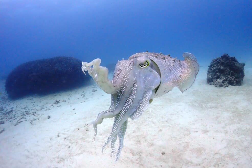 春先まで、冬のダイビングの楽しみはコブシメで決まり~!!サンゴに卵を産み付けるシーンも。