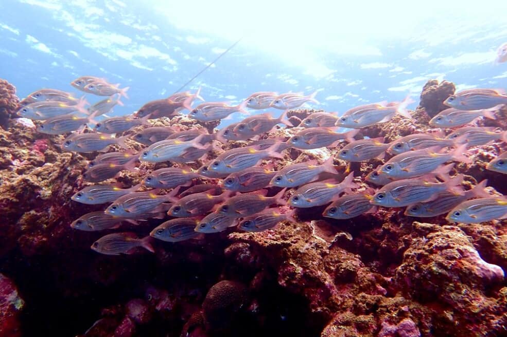 水中はやや白濁りはありましたが、それを吹き飛ばしてくれるくらい黄色が鮮やかなヨスジフエダイの群れ。群れ~。