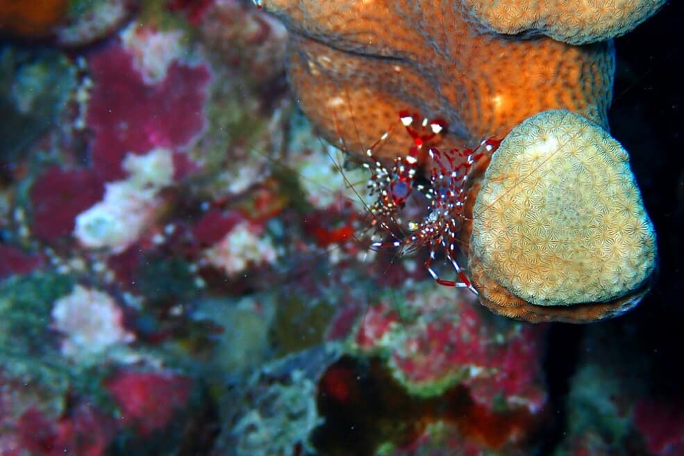 模様といい体の透け感といいきれいなベンテンコモンエビさん。今日はサンゴの上にちょこんと座って、
