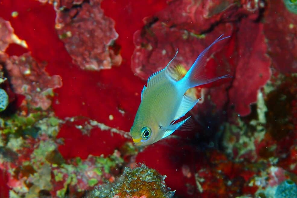 白い縁取りが綺麗なマルスズメダイの赤ちゃん。形も本当に美し姿のスズメダイです。