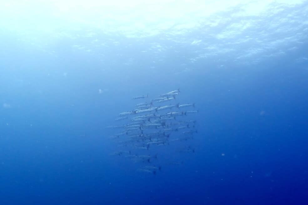 中層には、バラクーダの群れ~。周りにはバラフエダイの群れもたくさんいましたよ!