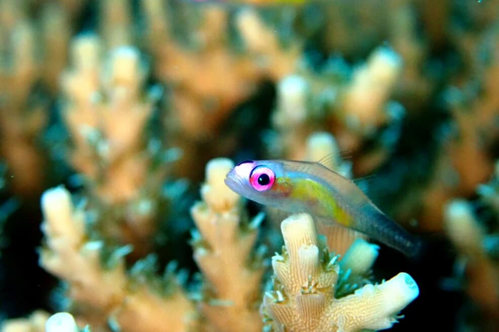 体の透け感、目のピンク色がきれいなアカメハゼ。
