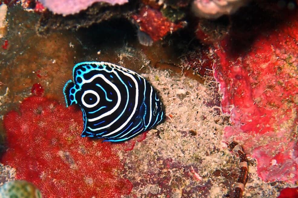 渦巻柄がきれいなタテジマキンチャクダイの幼魚。