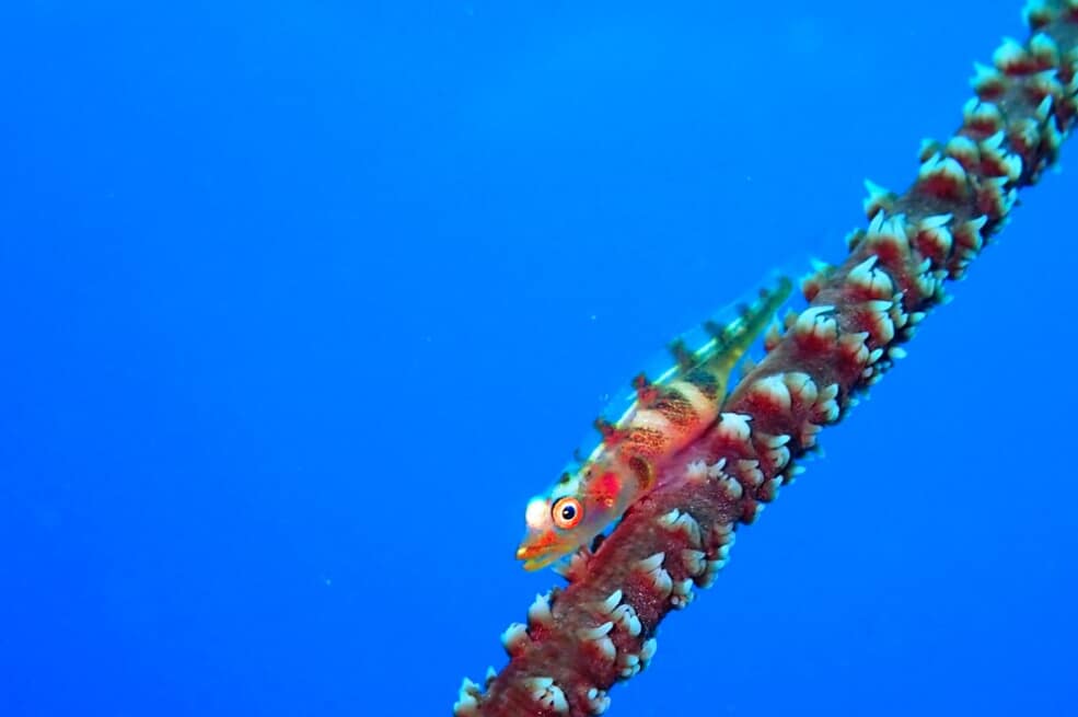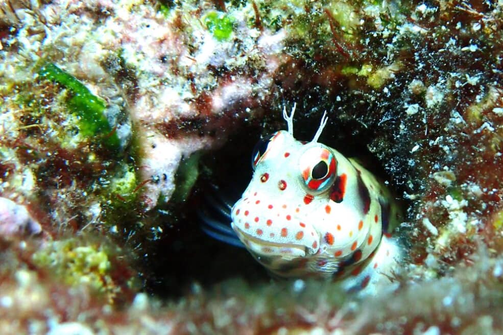マンタを満喫した後は、ゆっくり浅場ダイビング~!赤い点々模様と顔もかわいいモンツキカエルウオさん。