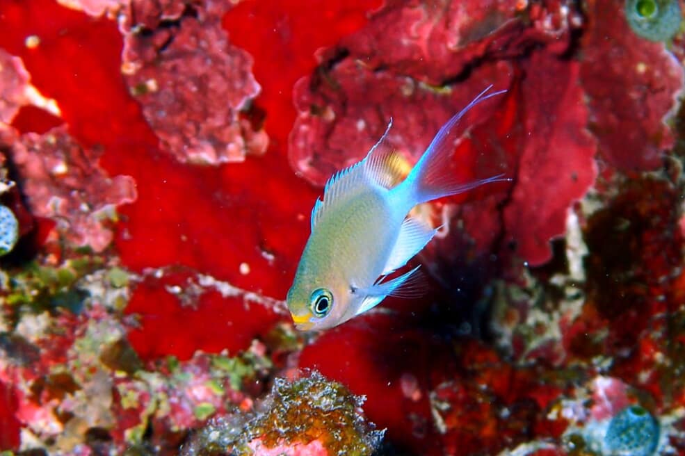 尻尾の美しい形&色。マルスズメダイの幼魚さん。いつ見てもかわいいです~。