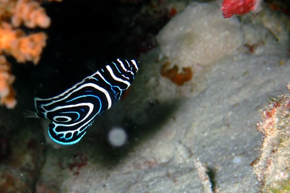 根の隙間を覗いてみると、最近ブログによく登場のタテジマキンチャクダイの赤ちゃんも!