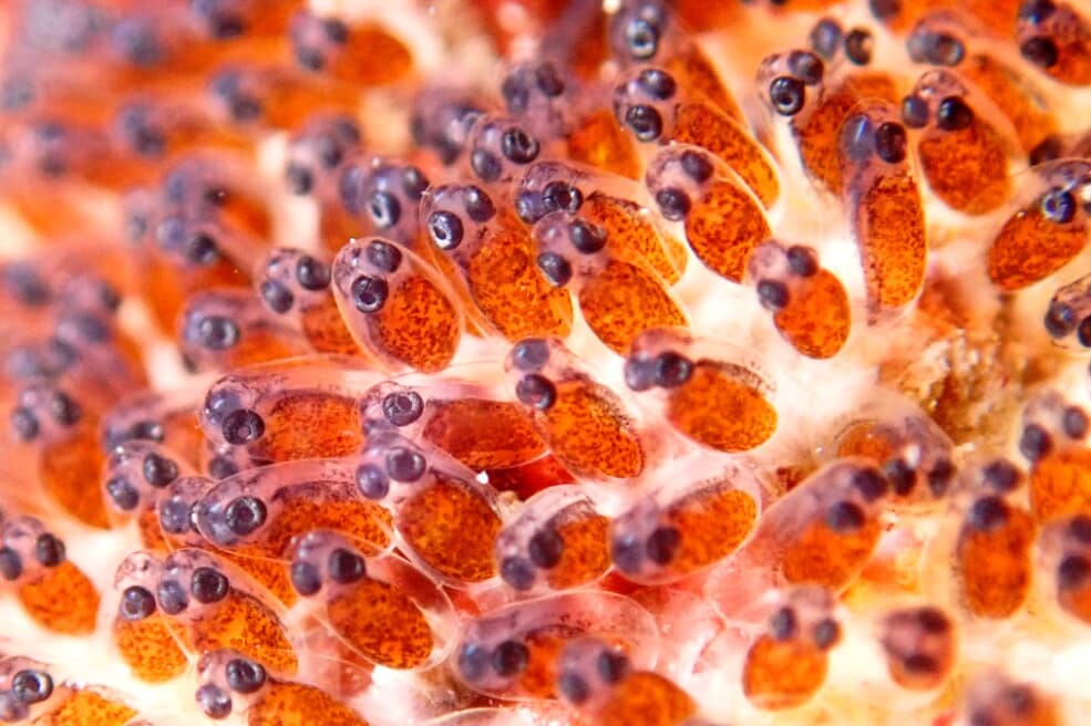 目がぱっちり!もうすぐ新たに誕生するカクレクマノミの卵もふ化寸前。