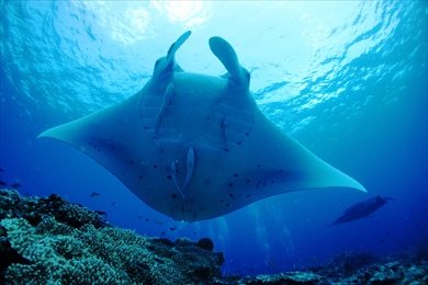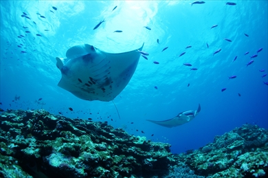 太陽に光のシャワー&サンゴ&マンタ 時期:6月~8月